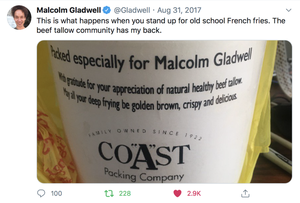 "In terms of freshness, flavor and texture, there really is no comparison to beef tallow French fries, which is exactly why we're so delighted when consumers can taste for themselves," Gustafson said. "Toward that end, we at Coast Packing encourage tallow fries lovers to help make this the definitive go-to guide to finding and savoring French fries fried right. As writer/social critic/food lover Malcolm Gladwell tweeted: https://twitter.com/gladwell/status/903273630070657024."